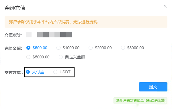 进入后台首页【点击】充值，进入到充值页面支持支付宝和USDT（USDT最低充值5$）新用户首次充值享10％赠送金额