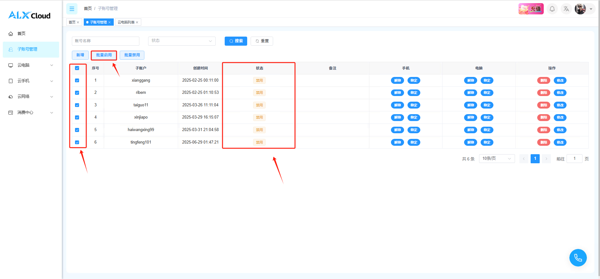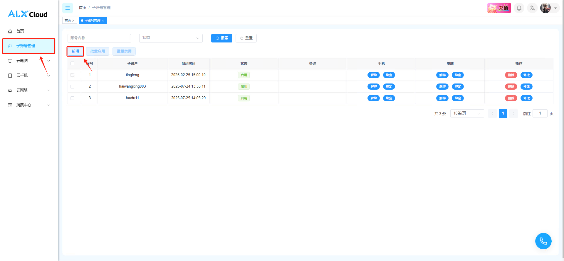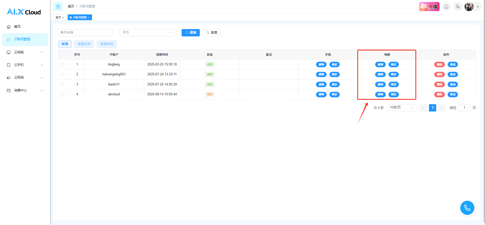 **接下来是为子账号绑定上对应的云电脑**