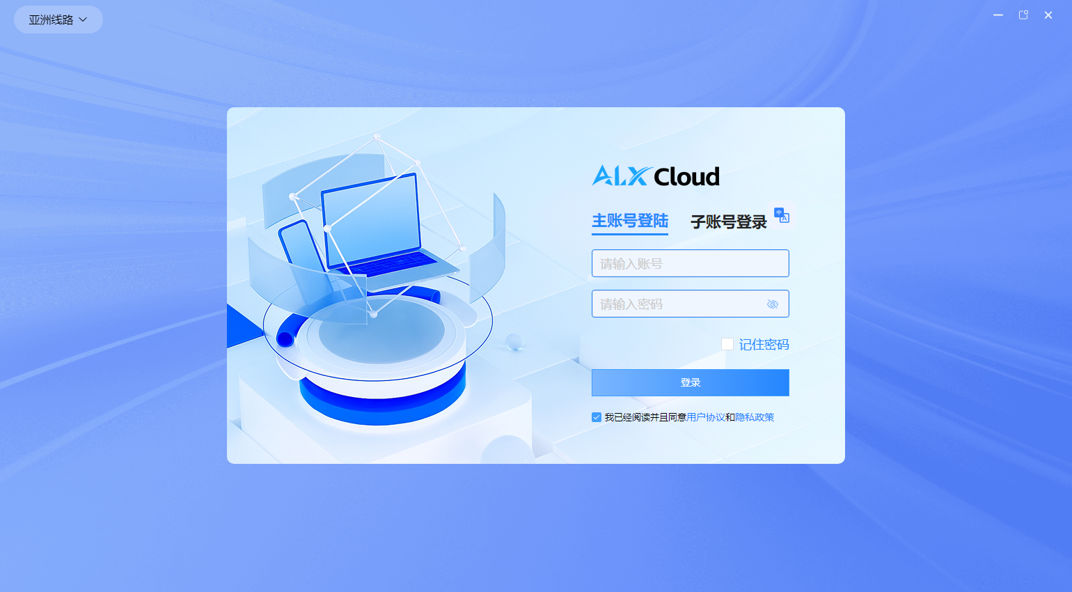 <mark style="color:red;">**登录注意事项**</mark>**：**<mark style="color:red;">**邮箱注册**</mark>**的账号是主账号（管理员），用邮箱登录时选择主账号，主账号登录之后可以看账号里所有的云电脑，可以对云电脑进行管理操作**