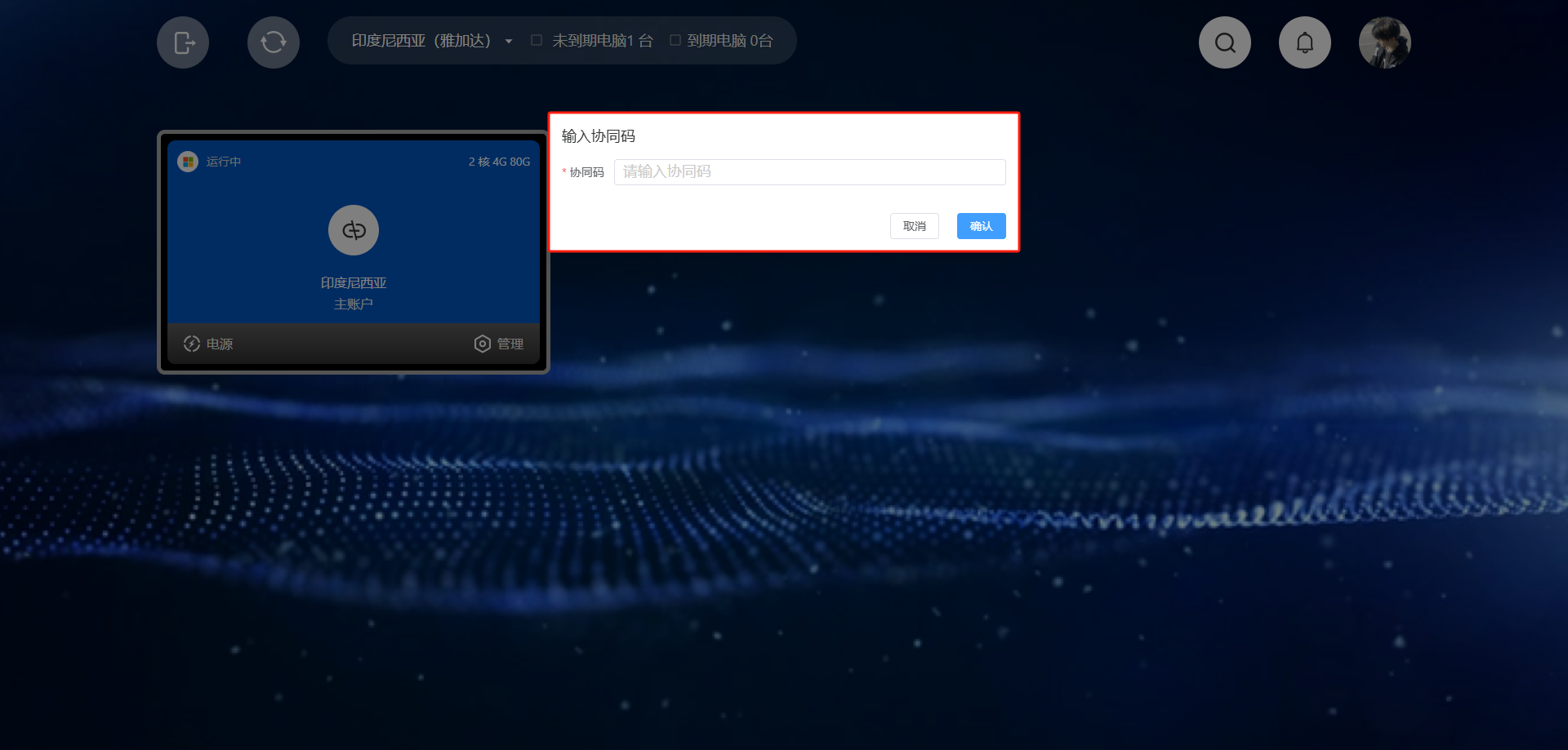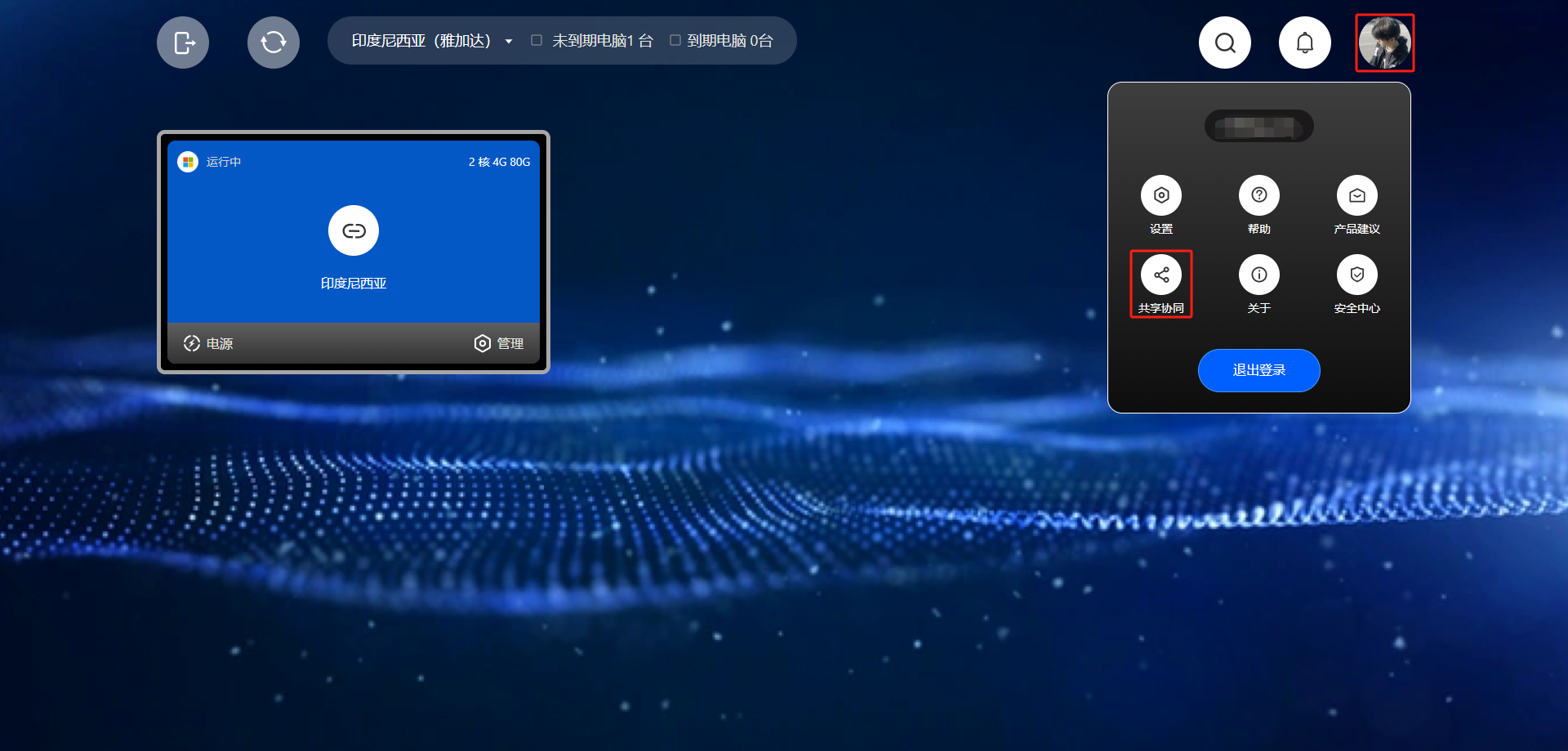 返回到连接云电脑界面，点击<mark style="color:red;">**头像**</mark>找到<mark style="color:red;">**共享协同**</mark>