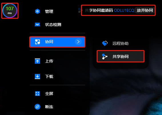 登录云电脑之后找到<mark style="color:red;">**悬浮球-协同-共享协同**</mark>，之后屏幕上会出现一个<mark style="color:red;">**共享协同邀请码**</mark>